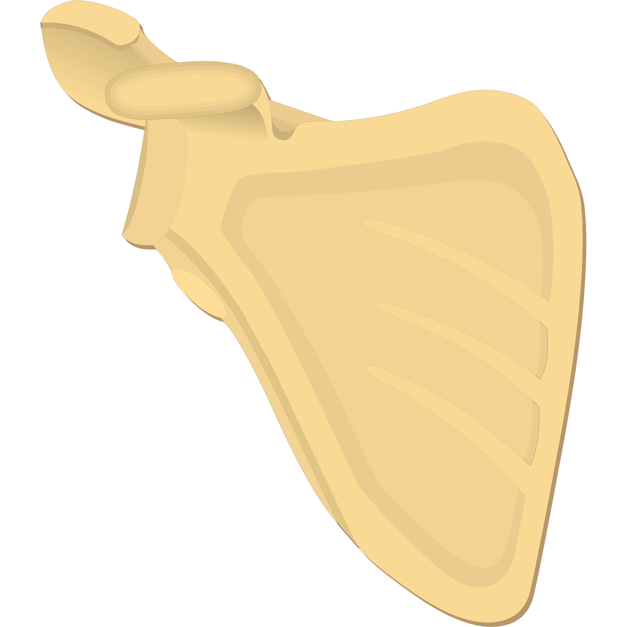 Parts of the right shoulder blade. It connects the humerus bone of the arm to the collarbone. Scapula is a flat triangular bone that connects the humerus and clavicle.
